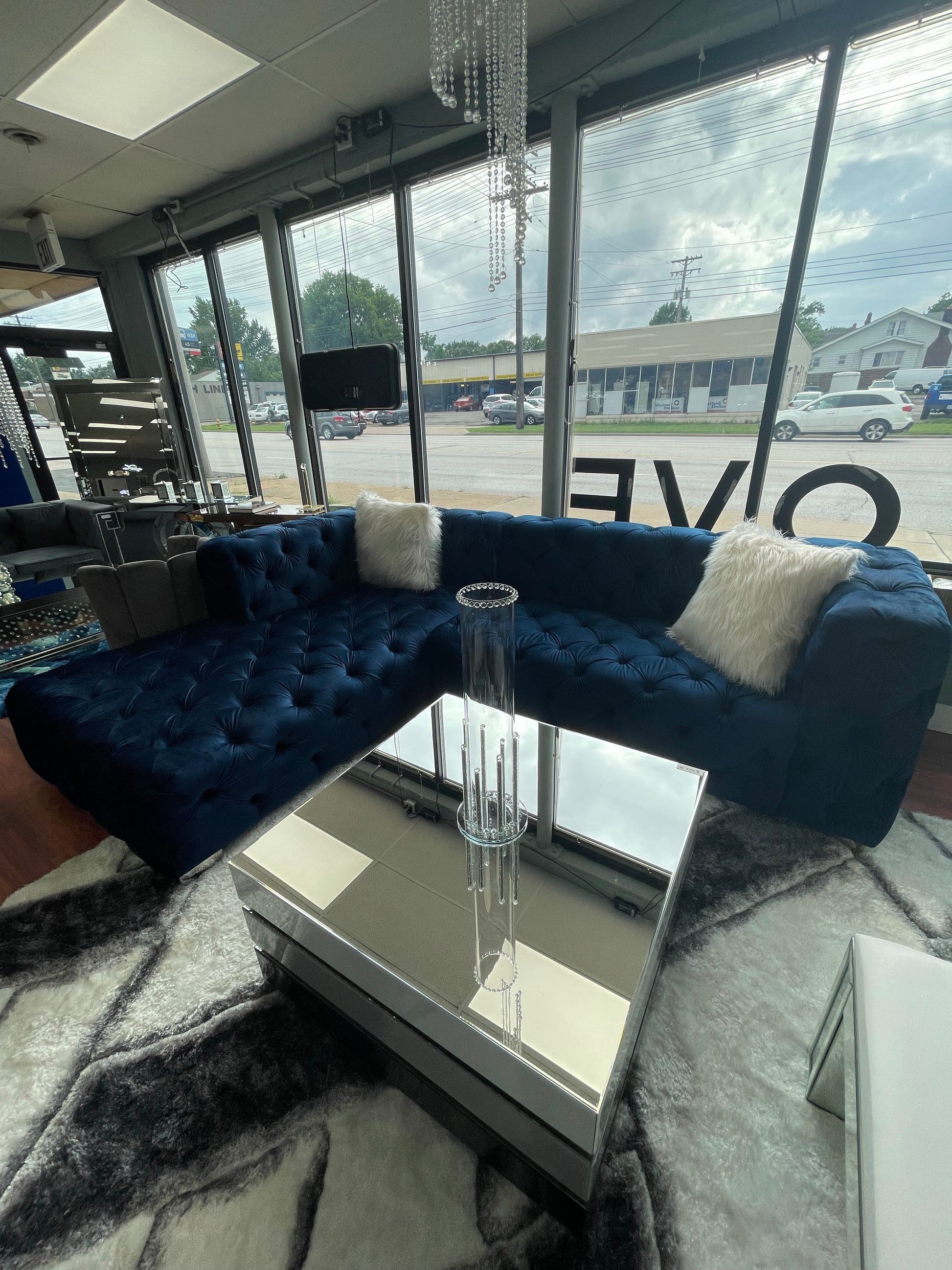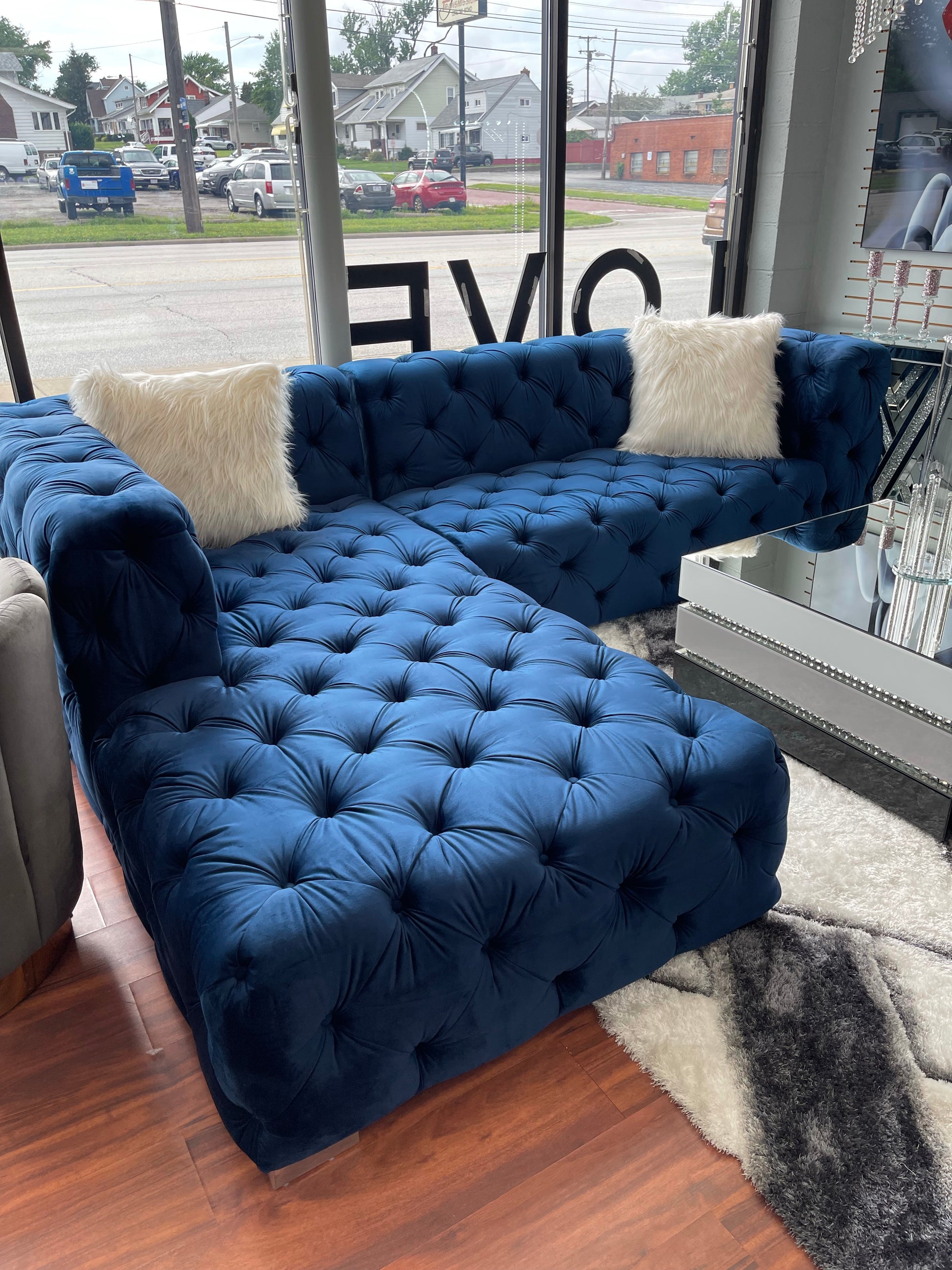 New Glam style tufted blue sectional with large chaise. Available in multiple colors.